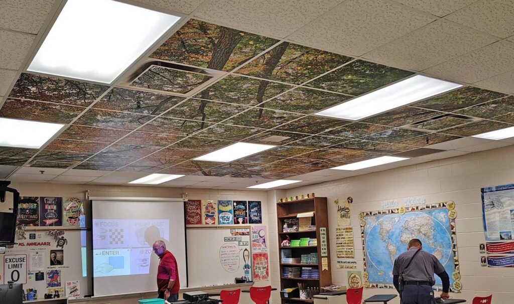 Today, the program installs high-resolution “tree ceiling” murals designed specifically for learning spaces. These ceilings are now in 20 school districts across nine states, serving more than 10,000 students. The results are consistently powerful: students are calmer, more focused, and more excited to be in school. Teachers report measurable improvements in classroom culture and attention.