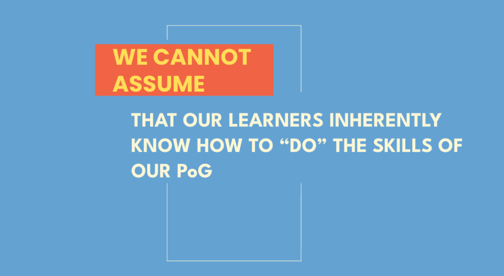 This is a very understandable pitfall of implementation. Most people who are teaching in classrooms across this country were trained in their own teacher preparation program to teach their content or their grade level. Very few of us were taught how to be teachers of PoG skills. So while we would not necessarily expect (nor condone) a teacher assessing content knowledge that had never been taught, it is fairly common for teachers to ask students to practice collaboration or self-directed learning or global perspective taking without ever delivering a lesson on these complex skills.