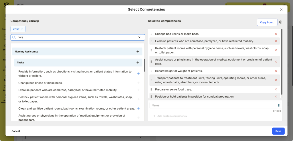 • The same competency list that was assembled at the start of the placement is what the evaluator sees and scores against. There is no drift between what was planned and what gets measured.