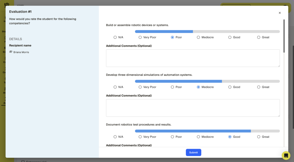 • Employer involvement is the differentiator. Whether the evaluation is conducted by the employer, in consultation with them, or as a self-assessment, the employer’s lens is what makes the data credible to the next employer in the student’s career.