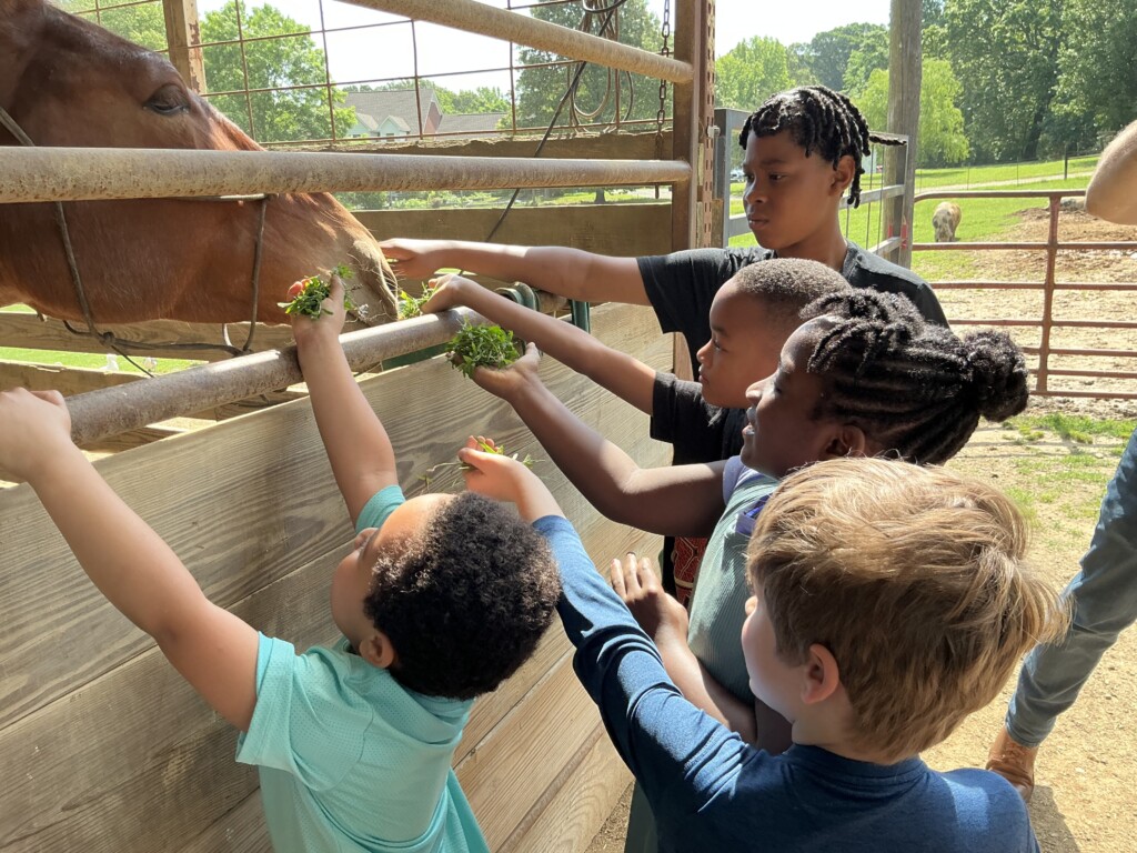 We arrive through a swinging metal gate, and enter a world of loquacious farm animals and majestic oak trees. Instantly, the children forage for rocks, transform sticks into tools, and extend their arms to pet the farm’s two placid horses, Thunder and Lightning. Nearby, the sheep bleat and the geese honk, while another group of children yelp excitedly after discovering a particularly robust ant colony.