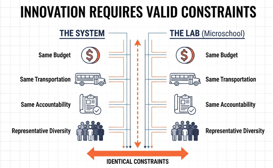 For learning to scale, the microschool must reflect the district’s demographics and operate within the same funding, transportation, and accountability systems.
