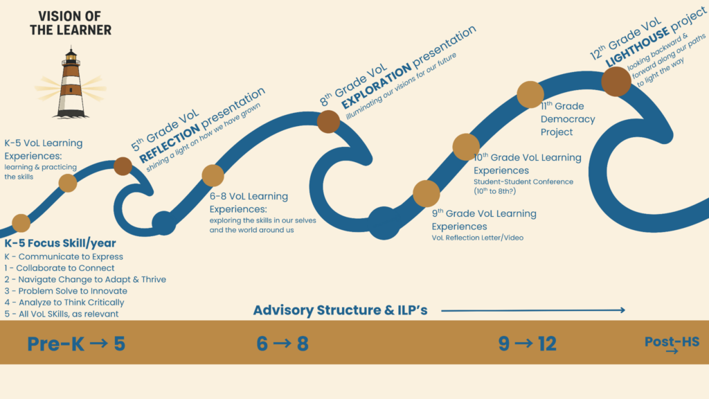 Public demonstrations of PoG skills can exert power as a lever of deeper implementation in other ways as well. As learners have key moments during their time at a school or district when they are invited to share their learning publicly, we also get a real window into how the skills are (and are not) living and breathing across the system. The ways in which learners are able to talk about the skills, and connect them to their academic understandings and to their lives outside of schools, are powerful indicators of how deeply they are engaging with the skills and/or where the PoG skills are more or less present in their daily experience. Establishing a system-wide set of benchmark or cornerstone moments works toward holding high expectations for all students and creating a foundation of shared ownership of the skills by all educators. I have seen this done in a variety of ways – student-led conferences, exhibitions of learning, presentations of learning, capstone projects, portfolio defenses, etc. The key component is that the PoG is the organizing principle of what/how students are sharing, and if you are able to build this as a K-12 Learning Journey, it also provides a transparent road map for how you are measuring progress and growth within the PoG. Here are a few examples of this that districts around New England are piloting: